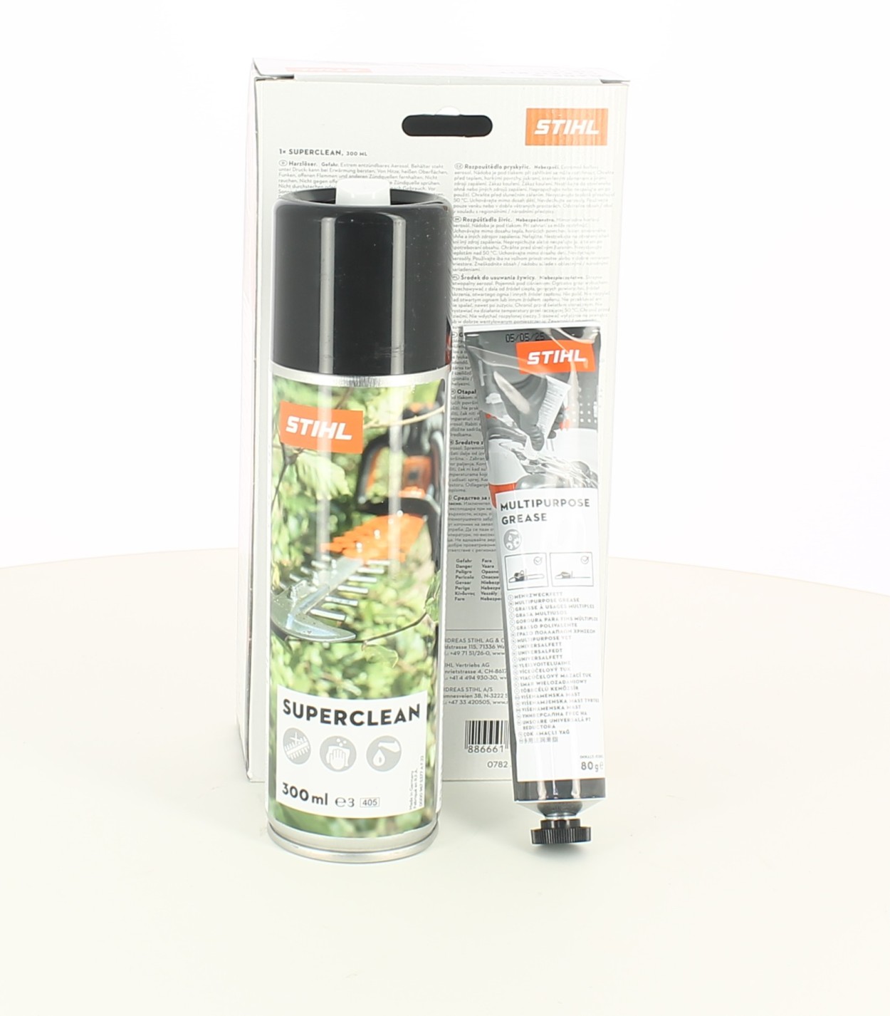 Das STIHL HS Plus Pflege- und Reinigungsset ist ein praktisches Set zur Reinigung und Pflege. Es hilft, Harz, Schmutz und Pflanzenreste zu entfernen und sorgt so für saubere und präzise Schnitte.