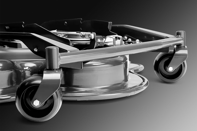 ![]() | Schwenkbare MähdeckräderDas Mähdeck ist mit Schwenkrädern ausgestattet, um auch in Kurven einen sanfteren Vortrieb zu ermöglichen. Die Räder verhindern zudem Schäden an der Rasenoberfläche. |