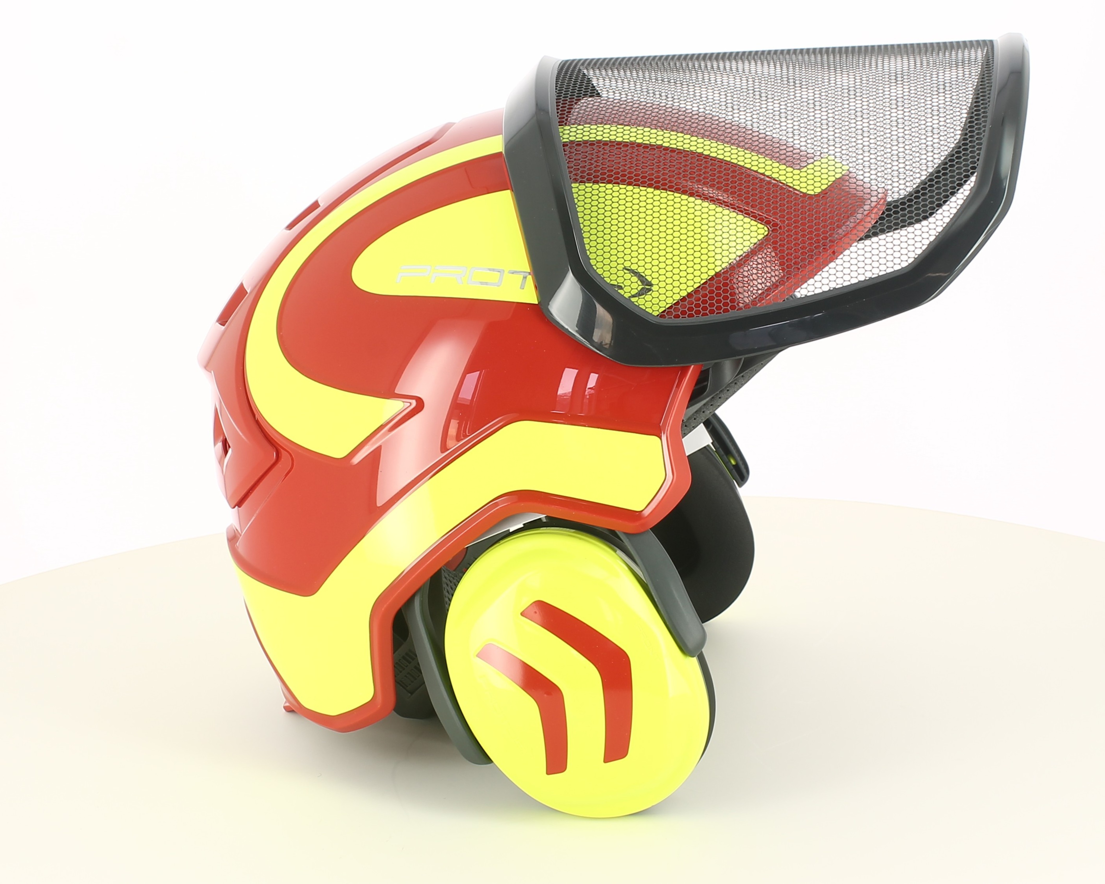 Der rot/gelbe Pfanner Protos Forest ist ein professioneller Helm, der speziell für Forstarbeiten und den Einsatz mit der Kettensäge entwickelt wurde. Er bietet Schutz, Komfort und die vollständige Integration von Visier und Gehörschutz in einem kompakten System.